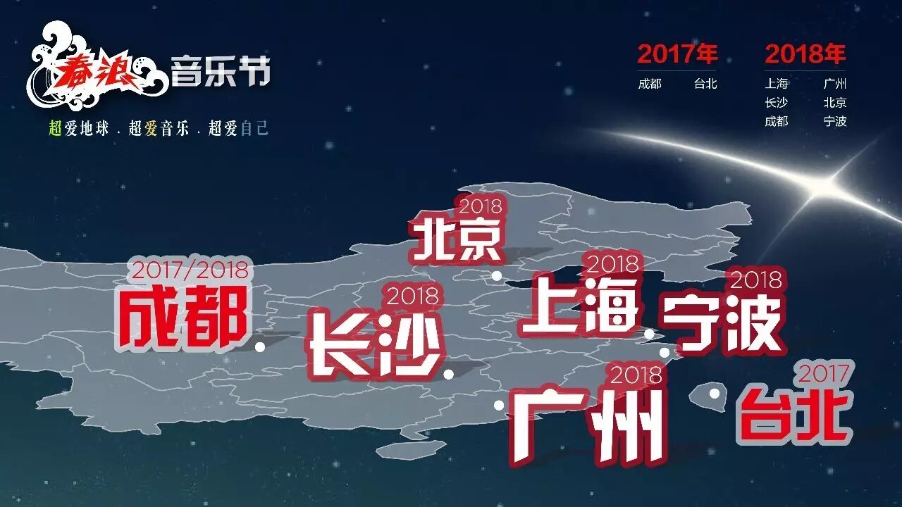 2017-2018春浪全年度巡回计划开跑,将陆续于各大城市爆燃。同时,“春浪”也将继续诠释其精神宗旨:"超爱地球、超爱音乐、超爱自己"。为了让大家可以不用出远门,就能欣赏海峡对岸最具特色的音乐文化氛围和青年生态。丙火创意旗下正火文化传媒有限责任公司与台湾春浪音乐节IP所有方联合成立新公司光音无限,致力开辟西南市场。